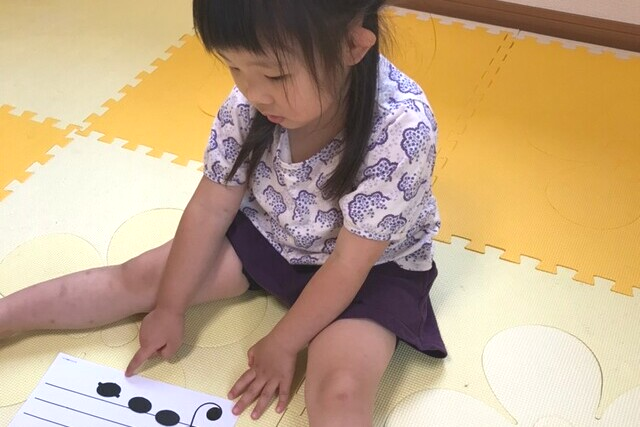 4歳児は模倣期からの脱皮が激しく、模倣を通して得たパターンを組み合わせ、オリジナルの思考を創造する創造期へと移っていく時期です。自立と自律した心や身体を育む導入の年です。リトミックでは、よく考えて表現することが多くなり、同時に音楽的な事柄もたくさん入ってきます。リトミックの活動を通して、よくわかる感触(手)、よく見える目、よく聞こえる耳を育んでいきます。線、丸、数字、ひらがなを少しずつ書くことを始めます。音の高低を認識し、表現したことを五線に表す導入をしていきます。表現したリズムを、線や文字、音符で表していきます。音高を伴ったリズムを右手と左手で表現することで、指や腕、身体のバランス感覚を育みます。